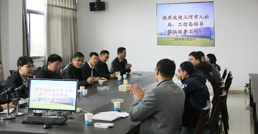 2019年3月27日下午,河北省三河市人社局、工信局領(lǐng)導(dǎo)及專(zhuān)家一行蒞臨我司考察指導(dǎo)工作。本市廣陵區(qū)對(duì)應(yīng)政府職能部門(mén)陪同考察交流。