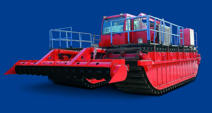 XWQY100型兩棲旋挖式清淤機是應用戶要求而專門設計的一種大型池塘水下清淤機械。該機以浮箱履帶為基礎實施工作移位,用旋挖頭切割和收集水下淤泥,用泥漿泵將泥漿吸走并排出,送到指定的排泥場,從而實現對大型池塘清淤的目的。 該機也可用于其他具有相似條件的河道、溝渠等淺水水域進行清淤作業(yè)。